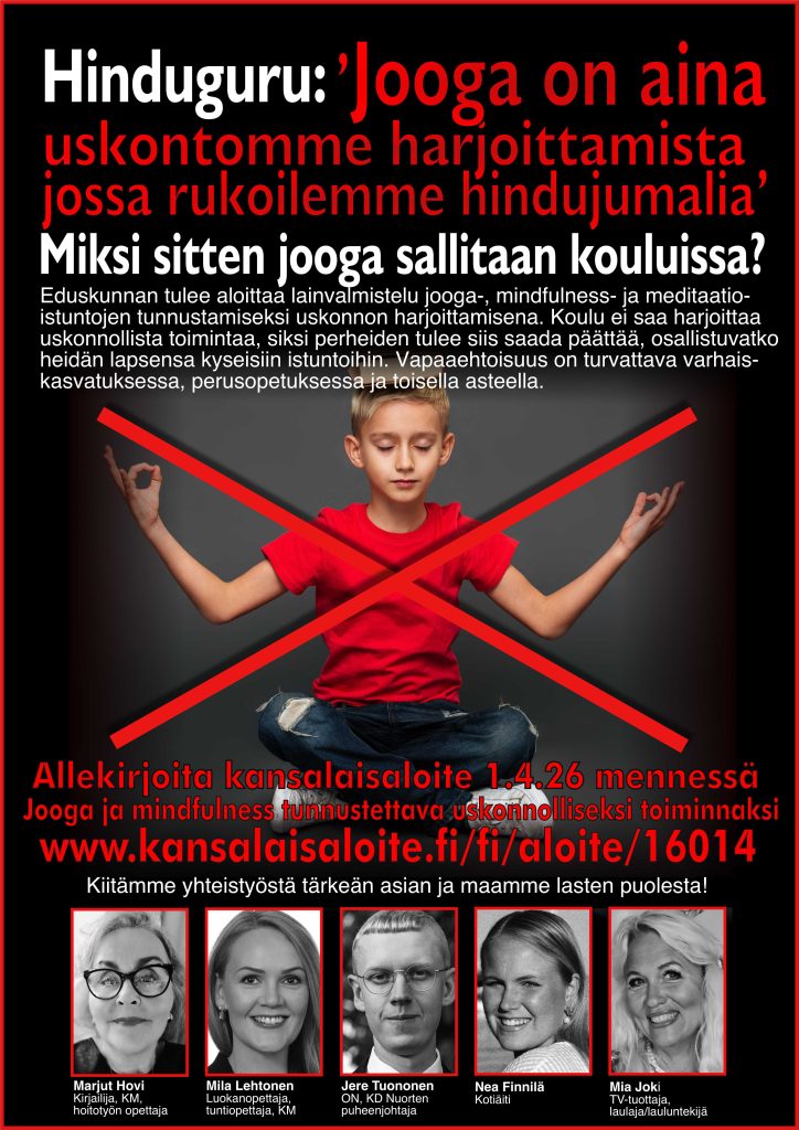Tiesitkö, että monissa kouluissa ja päiväkodeissa harjoitetaan hindujumalien palvontamenoja vanhempien tietämättä tai heiltä lupaa kysymättä. Kirjailija ja sairaanhoidon opettaja, Marjut Hovi, pyysi minut, Jere Tuonosen, Mila Lehtosen ja Nea Finnilän kanssa mukaan tärkeään kansalaisaloitteeseen.